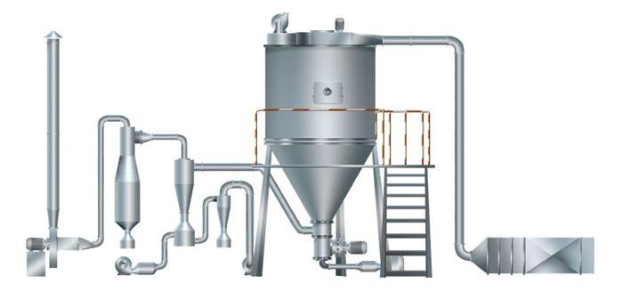 空氣經(jīng)過(guò)濾和加熱,進(jìn)入干燥器頂部空氣分配器,熱空氣呈螺旋狀均勻地進(jìn)入干燥室。料液經(jīng)塔體頂部的高速離心霧化器,(旋轉(zhuǎn))噴霧成極細(xì)微的霧狀液珠,與熱空氣并流接觸在極短的時(shí)間內(nèi)可干燥為成品。成品連續(xù)地由干燥塔底部和旋風(fēng)分離器中輸出,廢氣由風(fēng)機(jī)排空。